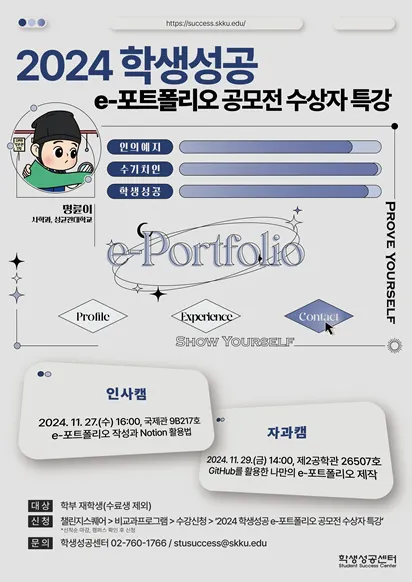 학생성공센터는 재학생들의 e-포트폴리오에 대한 이해 증진과 실습을 통한 제작법을 학습할 수 있는 e-포트폴리오 특강을 양 캠퍼스에서 개최합니다. 이번 특강은 2024 학생성공 e-포트폴리오 공모전 수상자를 초청하여 Notion과 GitHub를 활용하여 나만의 e-포트폴리오를 제작해 볼 수 있습니다. 이번 특강은 취업과 진로를 준비하기 위한 자신의 다양한 능력을 배양할 수 있는 좋은 기회로 아래의 정보를 확인하여 많은 신청 바랍니다.