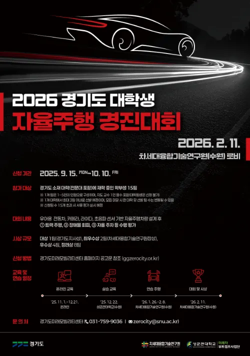 경기도미래모빌리티센터에서는 자율주행 분야의 활성화 및 인력양성에 기여하고자「2026 경기도 대학생 자율주행 경진대회」를 개최하오니, 관심 있는 학생 분들의 많은 지원 부탁드립니다.