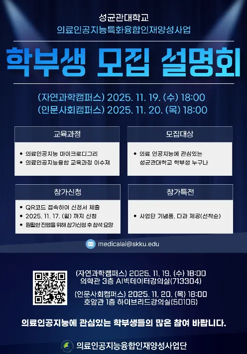 성균관대학교 의료인공지능융합인재양성사업단에서 「의료 인공지능 특화 융합인재 양성 사업」 참여 학부생 모집을 위해 학부생을 대상으로 설명회를 개최합니다.