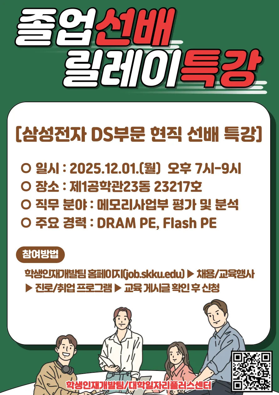 삼성전자 DS부문에 재직하고 계시는 선배님께서 후배 여러분들을 위해 특강을 진행하십니다.