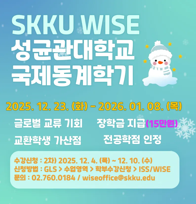 - 2025학년도 국제동계학기(WISE)에 한해 본교 재학생에게 참여 장학금 1인당 15만원 지급(수강 과목 PASS 시)