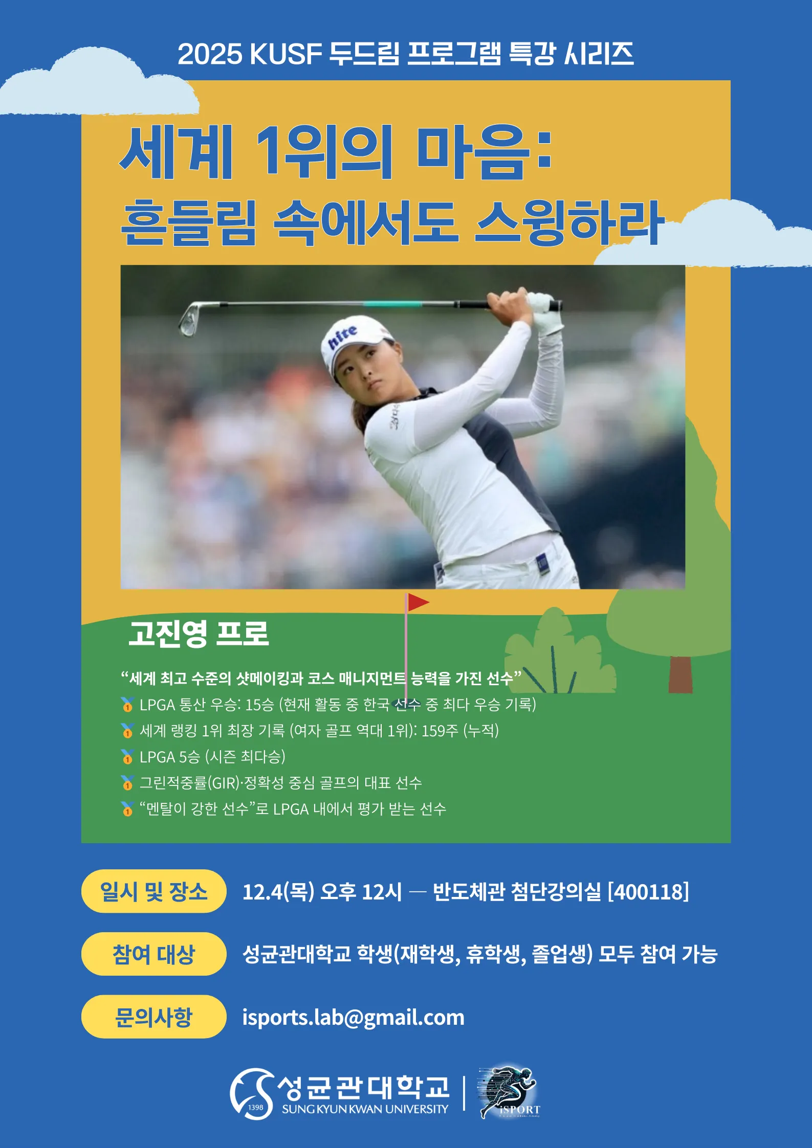 고진영 프로는 매 시즌 세계 최정상에서 느끼는 압박감과 멘탈 관리 전략, 여러 차례 겪었던 슬럼프를 극복한 과정, 최고의 경기력을 유지하기 위한 훈련 루틴·체력 훈련·일상 관리법, 그리고 성균관대에서 보냈던 시간들이 현재의 선수 생활에 어떤 영향을 주었는지 등을 진솔하게 들려줄 예정입니다.