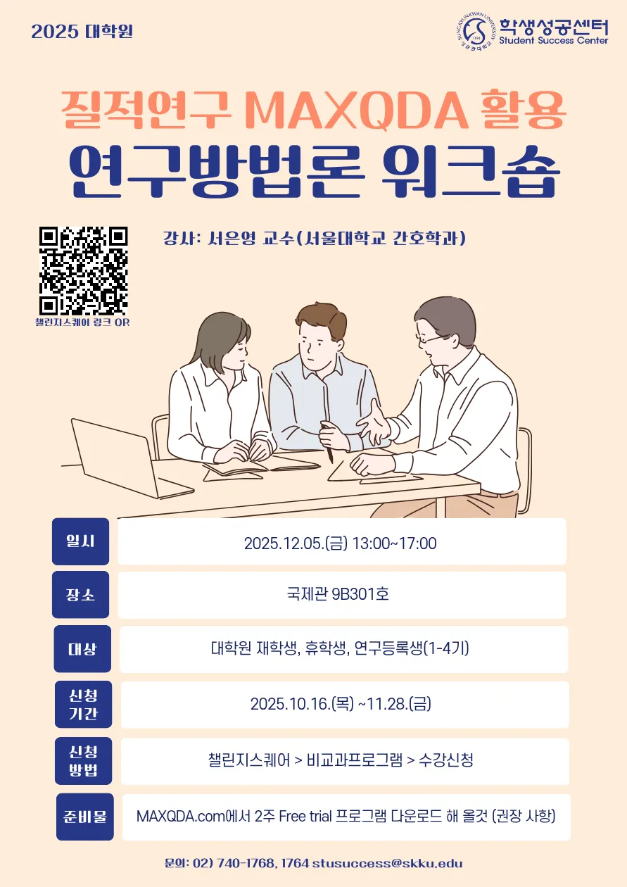 대학원생 여러분의 많은 신청 바랍니다. ㅁ 대상: 성균과대학교 대학원생 재학생, 연구등록생(1~4기) ㅁ 신청방법: 챌린지스퀘어(https://chsquare.skku.edu ) > 비교과프로그램 > MAXQDA ㅁ 신청기간: 2025.10.16.(목)~11.28.(금) 23시 50분 까지 ㅁ 강사: 서은영 교수(서울대학교 간호과) ㅁ 일정 및 장소: 2025.12.05.(금) 13:00~17:00 국제관9B301호