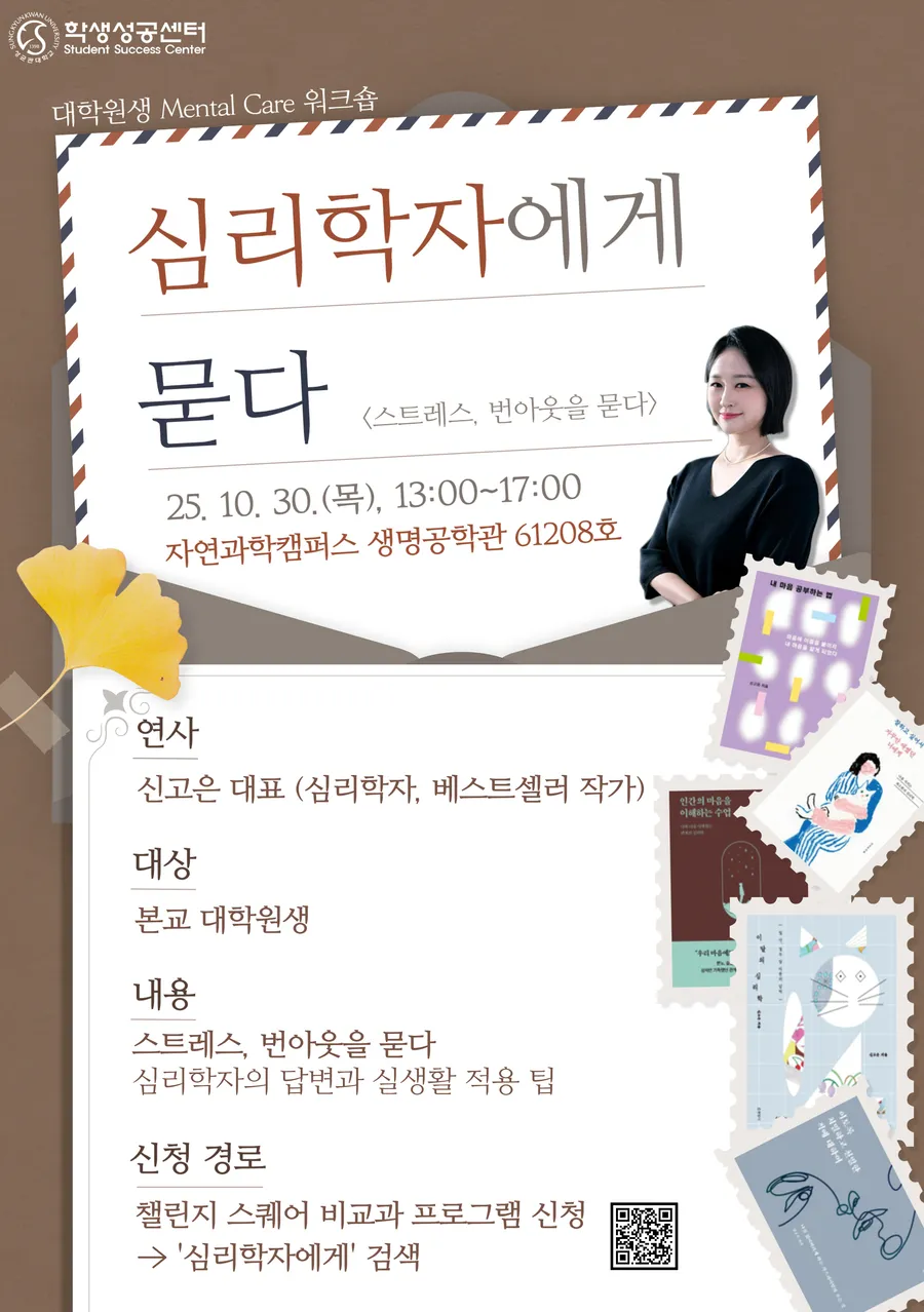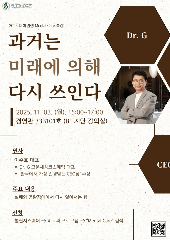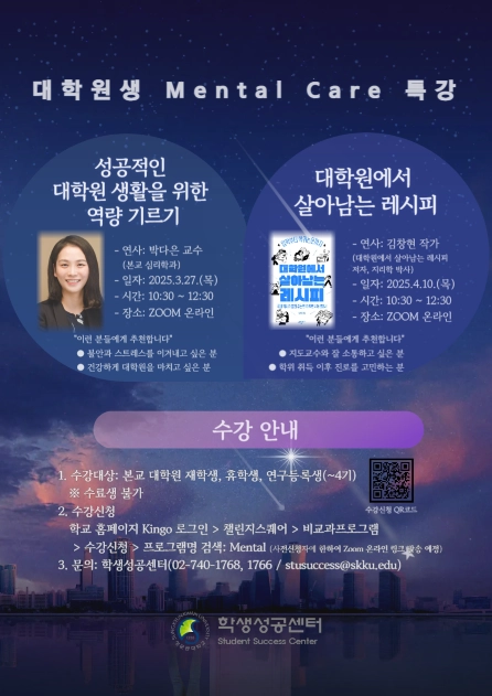 대학원생을 위한 정서 지원 프로그램의 일환으로 대학원생의 스트레스 및 정신건강 관리를 위한 대학원생 Mental Care 특강을 개최합니다. 건강하게 대학원 생활을 할 수 있는 비법을 공개합니다. 자세한 사항은 학교 홈페이지 공지사항을 확인해 주세요.