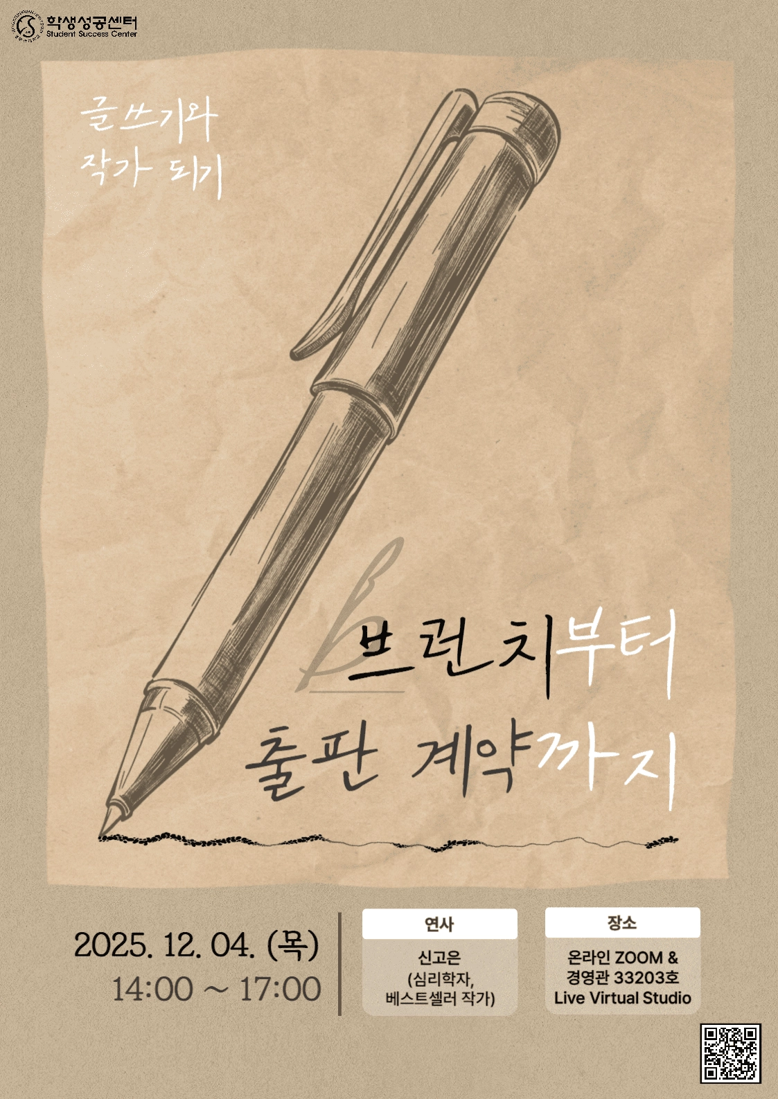 1. 참여형태: 온/오프라인 하이브리드 (오프라인 선착 50명 수용/Zoom 접속) 2. 참여장소: Zoom 미팅룸 추후 안내 3. 연사에게 궁금한 점은 사전질문이 가능합니다 (공지사항 및 포스터 참조) 4. 문의: 학생성공센터 (02-740-1768, 1766)