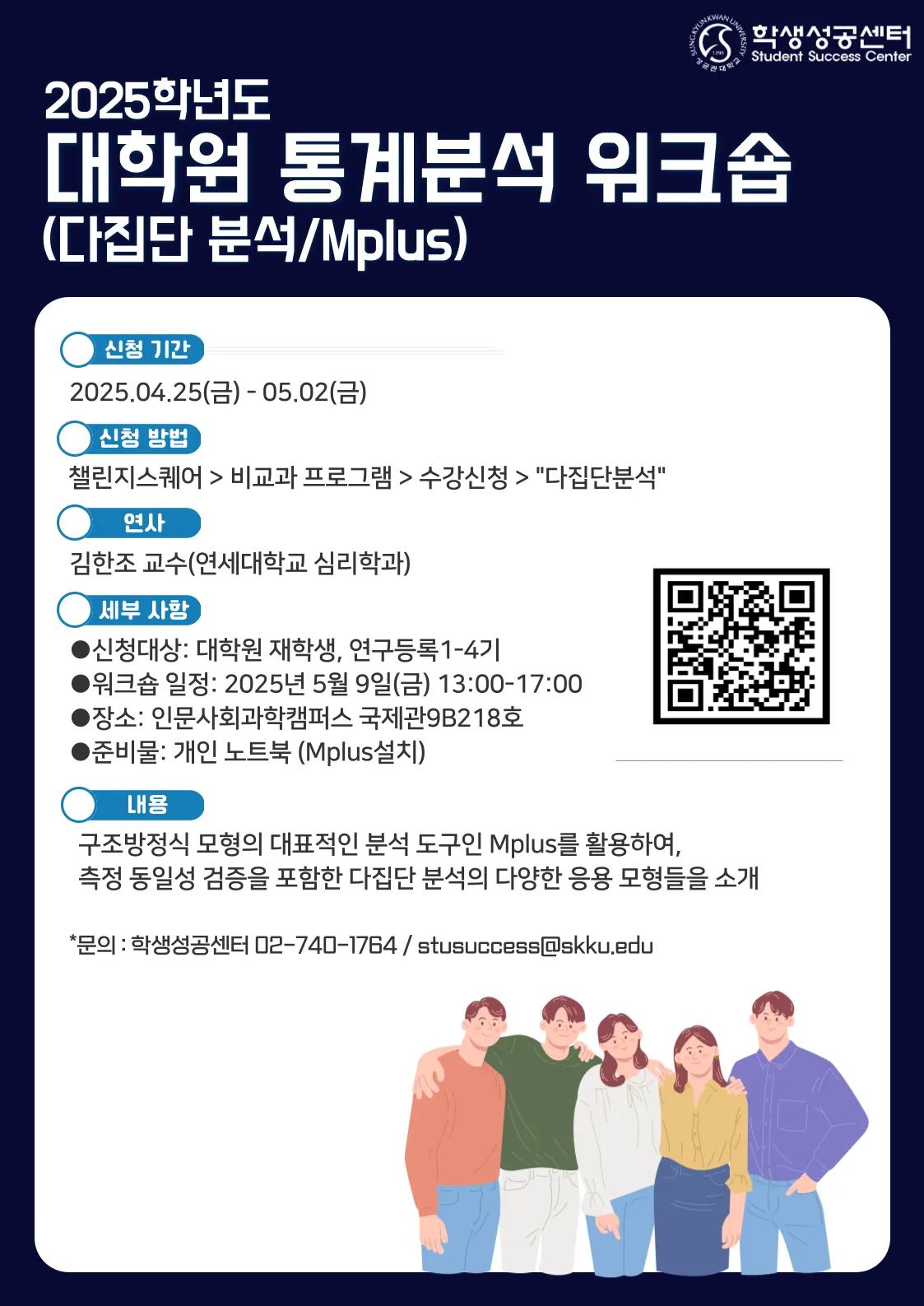●신청기간 및 방법 - 신청기간: 2025.4.25.(금) - 2025.5.2.(금) - 신청방법: 챌린지스퀘어 > 비교과프로그램>수강신청> “다집단분석” (QR삽입) ●신청대상: 대학원 재학생, 연구등록1-4기 ●워크숍 일정: 2025년 5월 9일(금) 13:00-17:00 ●장소: 인문사회과학캠퍼스 국제관9B218호 ●준비물: 개인 노트북 (Mplus설치) ●연사: 김한조 교수(연세대학교 심리학과)