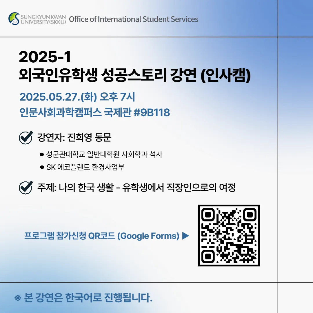 성균관대학교에 재학 중인 외국인유학생들이 진로와 학업 로드맵을 설계하는 데 실질적인 도움을 주고자 매 학기 운영되고 있으며, 강연 후 Q&A 시간을 통해 선배 유학생과의 소통 기회도 함께 제공됩니다.