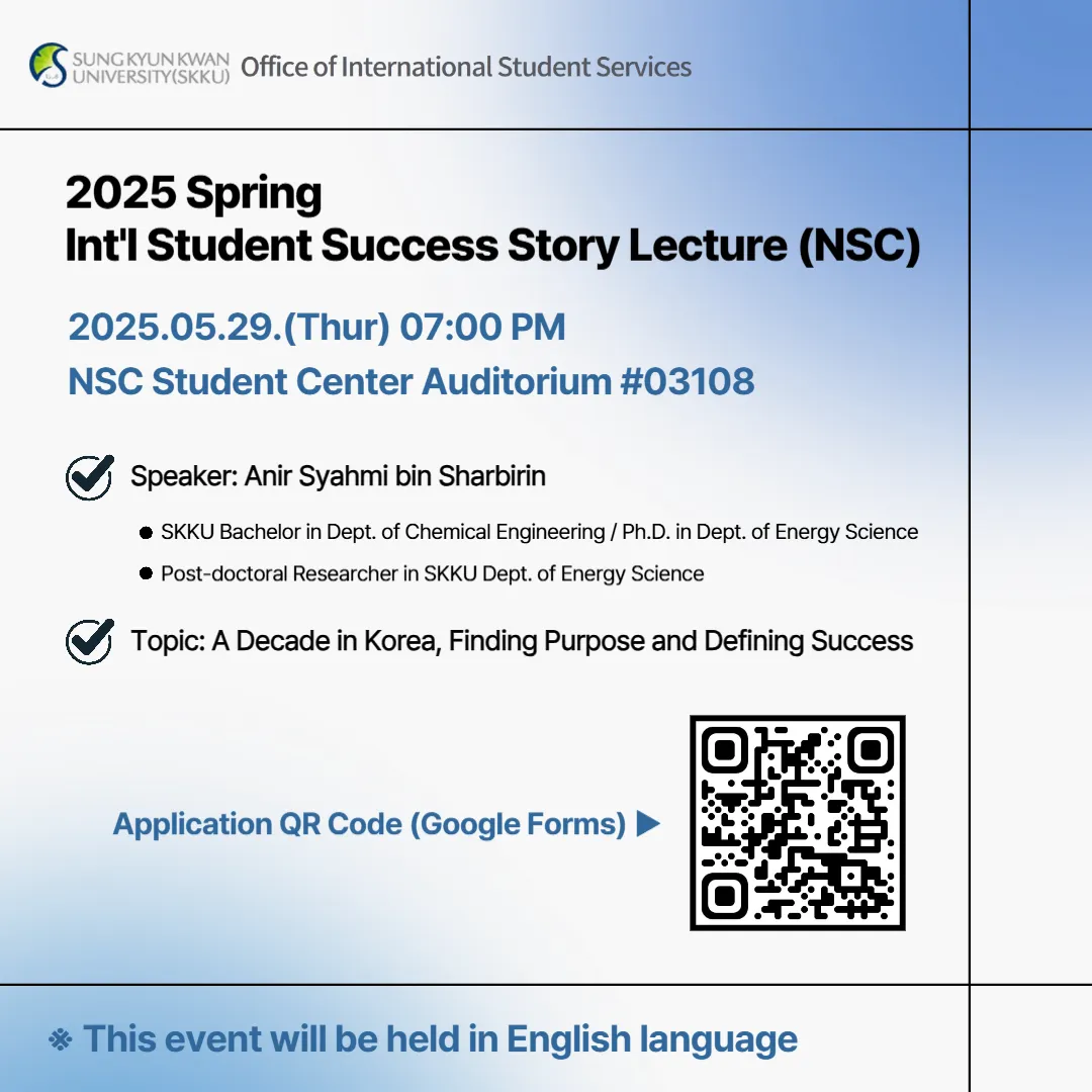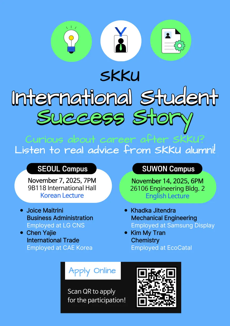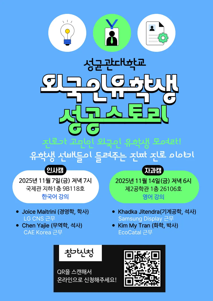 This lecture is held each semester to provide practical guidance for current international students at Sungkyunkwan University in planning their career and academic roadmaps. A Q&A session is also included to offer opportunities for direct communication with alumni.