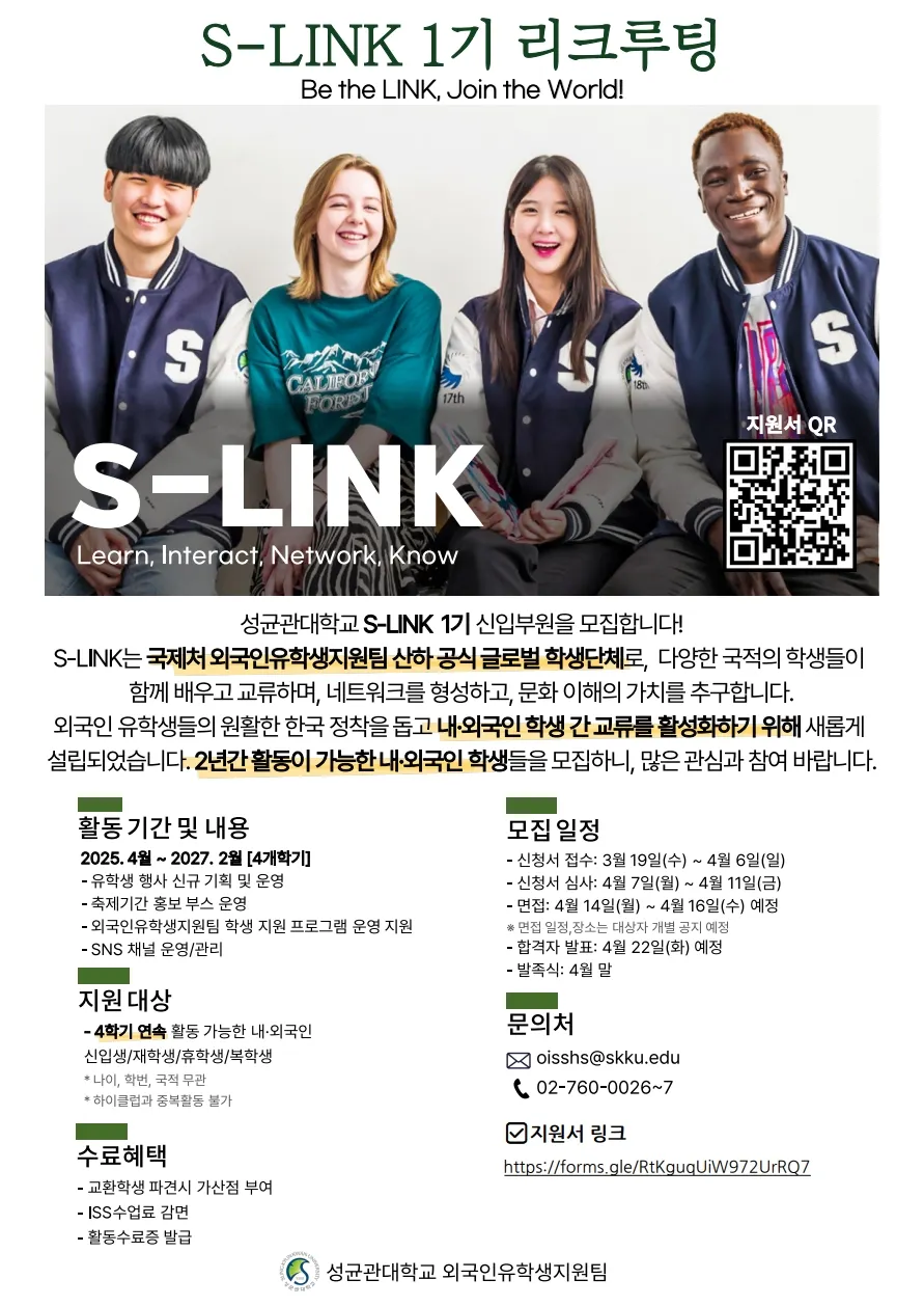S-LINK는 국제처 외국인유학생지원팀 산하 공식 글로벌학생단체로서,