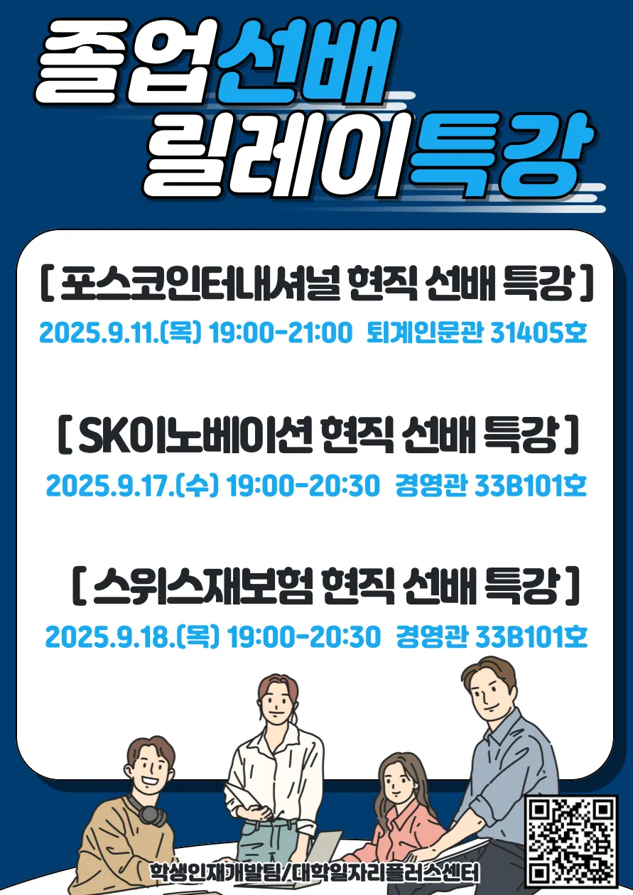 1. 개 요: 다양한 직무의 졸업선배 특강을 통한 직무탐색 기회 제공 2. 시 간: 1시간~3시간 3. 교육내용: 직무별 졸업선배 소속의 회사 및 직무 소개, 담당 업무 프로세스, 하루일과, 직무 동향 및 전망, 졸업선배 직무 선택 계기, 직무 핵심역량, 채용 프로세스 및 전형별 TIP 등 소개