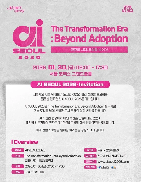 AI SEOUL 2026, The Transformation Era: Beyond Adoption ― 전환의 시대, 도입을 넘어선 ― 본 컨퍼런스는 AI 산업과 기술을 비롯하여 정책과 도시 전반을 함께 다루는 자리로, 산·학·연·정 간의 교류와 협력을 확대하고자 기획되었습니다. 많은 관심과 참여 부탁드립니다.