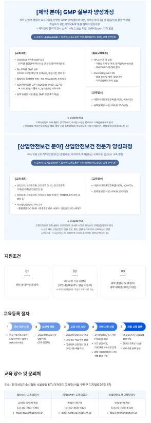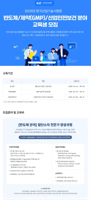 한국산업기술시험원에서 2026년 반도체/제약(GMP)/산업안전보건 분야 교육생을 모집하오니, 학생 여러분의 많은 참여 부탁드립니다.