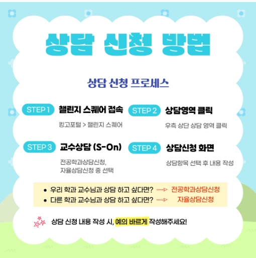 챌린지스퀘어 → 상담영역 → 교수상담(S-On) 메뉴에서 신청