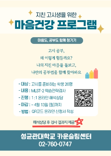 안녕하세요. 2026년 1학기 '고시생 마음건강 프로그램' 참여자를 모집합니다~!