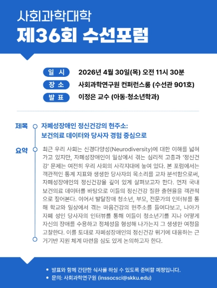 <사회과학대학 제36회 수선포럼 개최> 일시: 2026년 4월 30일(목) 11:30~13:00 장소: 사회과학연구원 컨퍼런스룸(수선관 901호) 발표: 이정은 교수(아동·청소년학과) 주제: 자폐성장애인 정신건강의 현주소: 보건의료 데이터와 당사자 경험 중심으로