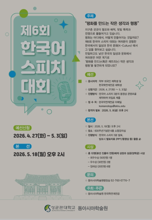 동아시아학술원에서는 학부 외국인 및 한국학연계전공 재학생의 한국어 말하기 능력 향상을 위하여 한국어 스피치 대회를 아래와 같이 개최합니다