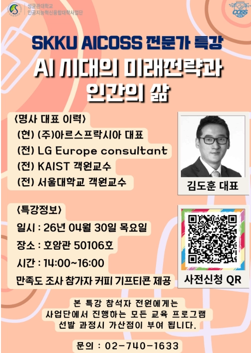 - 본 특강 참석자 전원에게는 AICOSS 사업단에서 진행하는 모든 교육 프로그램(2학기 운영 해외교육(호주, 미국), 경진대회, CO-Week 등) 선발 시 가산점이 부여됩니다!