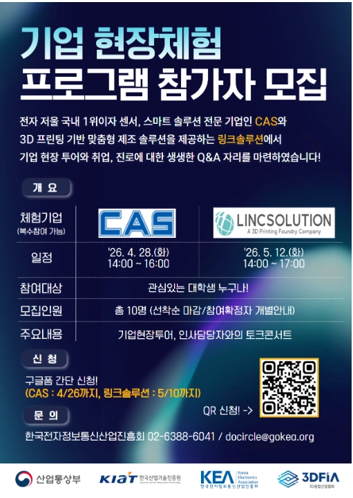 센서·데이터·자동화 기술이 결합된 스마트 솔루션 기업과, 디지털 제조·적층제조 기술을 기반으로 산업 혁신을 이끌고 있는 기업이 실제로 어떤 일을 하는지, 어떤 직무와 인재를 선호하는지 현장에서 직접 확인해 볼 수 있습니다!