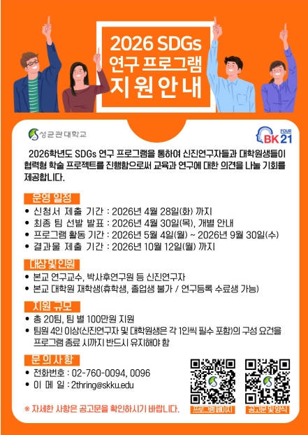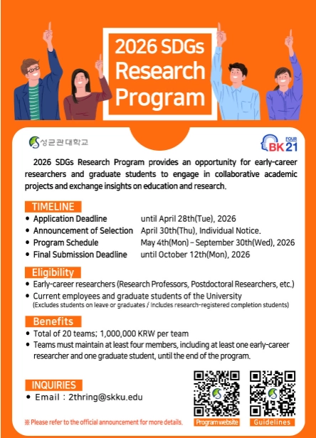 2026학년도 SDGs 연구 프로그램을 통하여 신진연구자(연구교수, 박사후연구원)들과 대학원생들이 협력형 학술 프로그램을 진행함으로써 교육과 연구에 대한 의견을 나눌 기회를 아래와 같이 제공하고자 하오니 많은 참여 바랍니다.