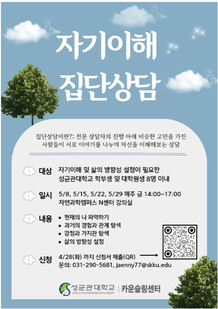 안녕하세요, 카운슬링센터에서 자기이해 집단상담 참여자를 모집합니다.