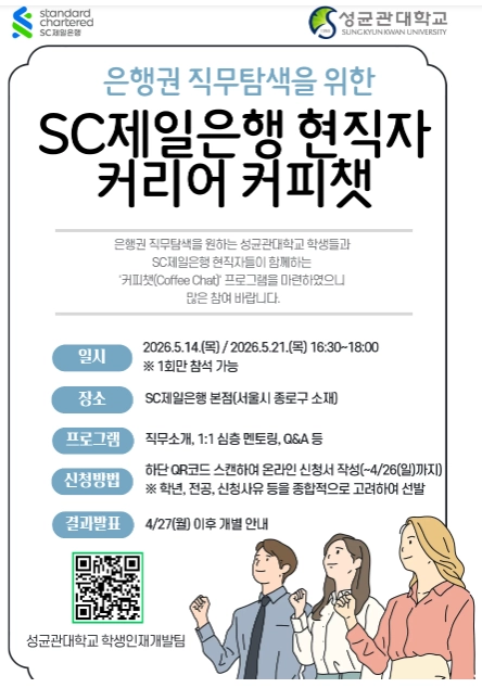 SC제일은행은 미래를 이끌 청년들의 경제적 자립과 성장을 목표로 다각적인 '청년 커리어 멘토링' 활동을 전개하고 있습니다. 이 일환으로 은행권 직무탐색을 원하는 성균관대학교 학생들과 SC제일은행 현직자들이 함께하는 '커피챗(Coffee Chat)' 행사를 진행하고자 하오니 많은 관심과 참여를 바랍니다.